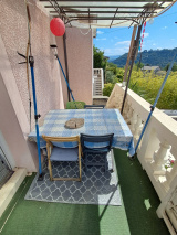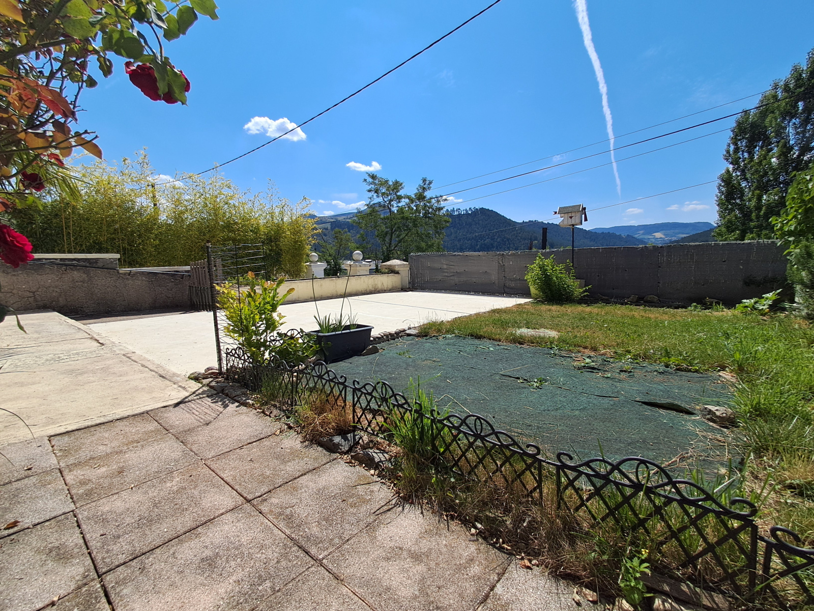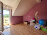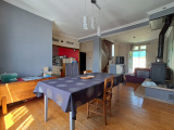 À l'étage, la maison dispose d'une grande pièce à vivre avec un poêle à bois ouvert sur une cuisine équipée, une chambre et un WC. Une première terrasse orientée au sud est accessible depuis la cuisine, et une deuxième terrasse est accéssible par le salon ou le rez-de-jardin.