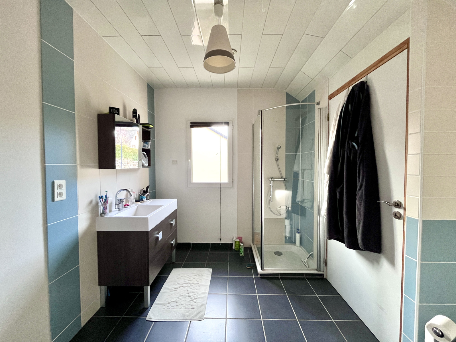 Maison de lotissement de 2007 de type 5 de plain-pied avec un double garage et terrain attenant. Cette maison sans aucuns travaux à prévoir bénéficie d'une excellente performance thermique. Elle présente en rez de jardin un double garage, une buanderie, une suite parentale et une pièce de vie lumineuse avec poêle bois et plancher chauffant au sol; à l'étage, une pièce pallière, un bureau, une salle de douche et trois chambres.