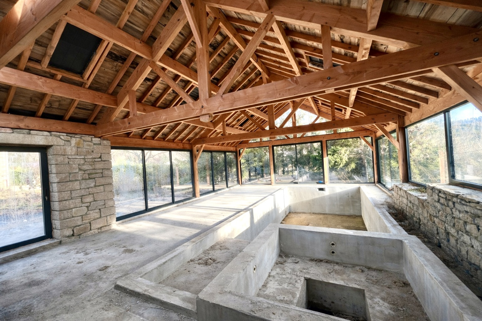 Maison sur une parcelle de terrain de 2427 M2 avec trois garages, et projet de piscine intérieure couverte indépendante à finir d'aménager. Cette maison en pierres, couverture lauzes, menuiseries double vitrage alu, terrain aménagé est éventuellement divisible en deux appartement d'environ 140 M2 chacun tous deux de plain-pied avec le terrain naturel. Elle se compose en rez de cour d'un hall d'entrée desservant deux garages, et une cave; aux étages supérieurs, deux appartements de type 4; au dernier niveau, un grand plateau de grenier aménageable.