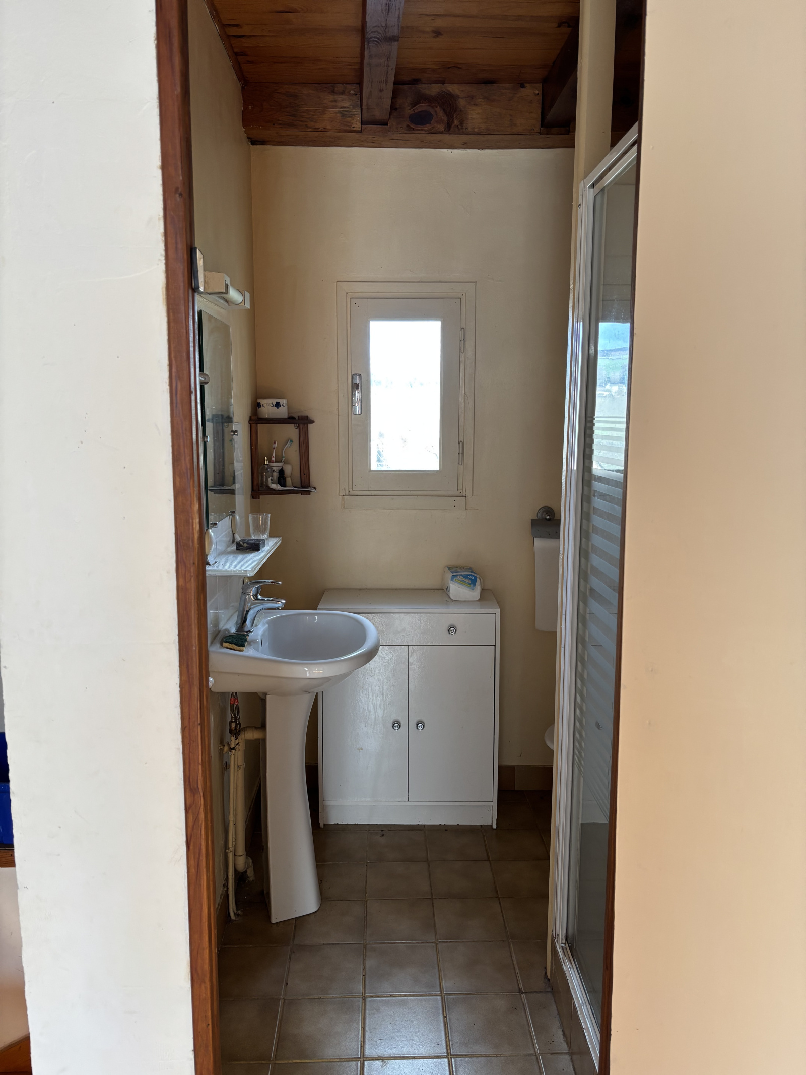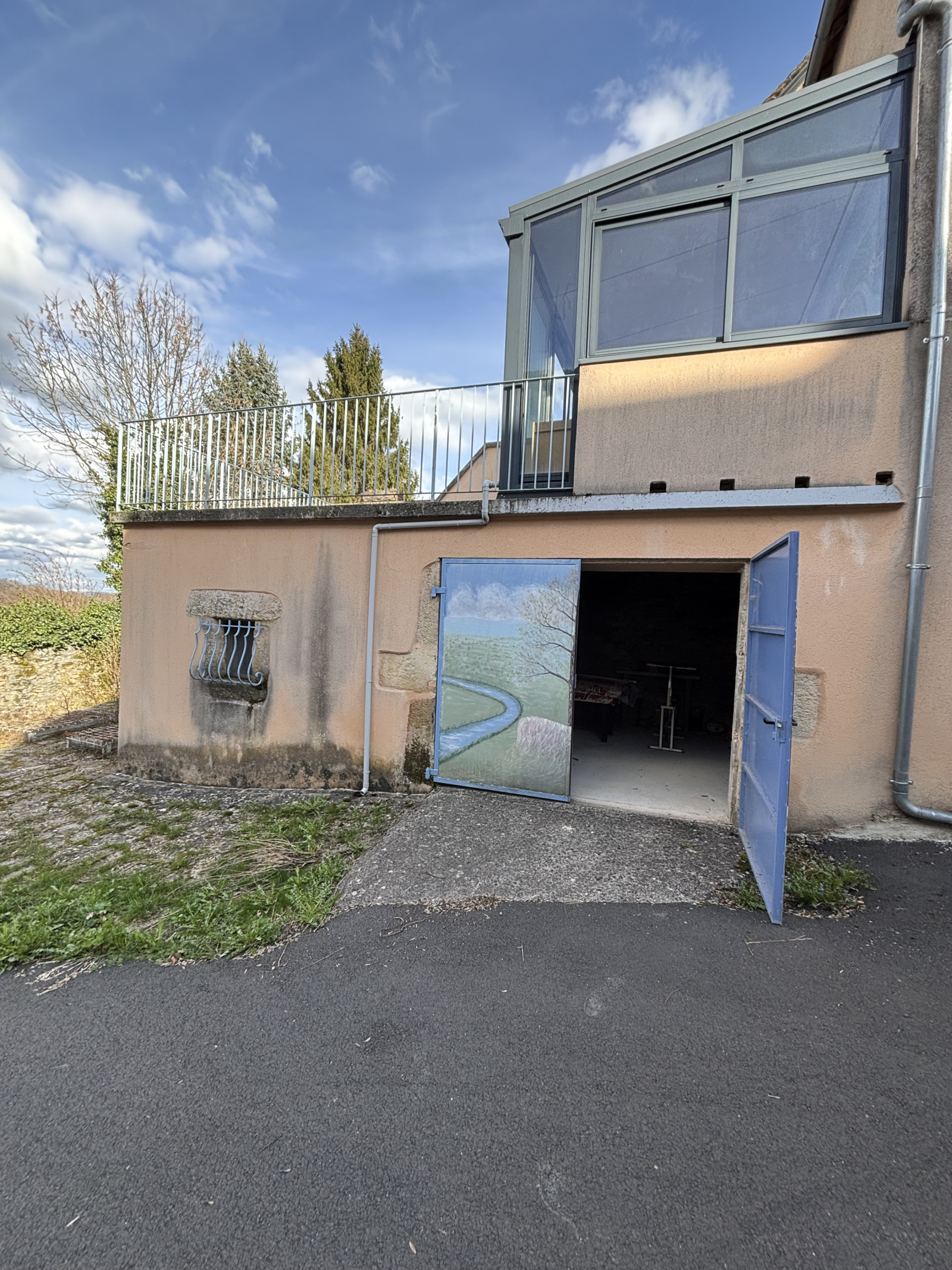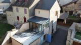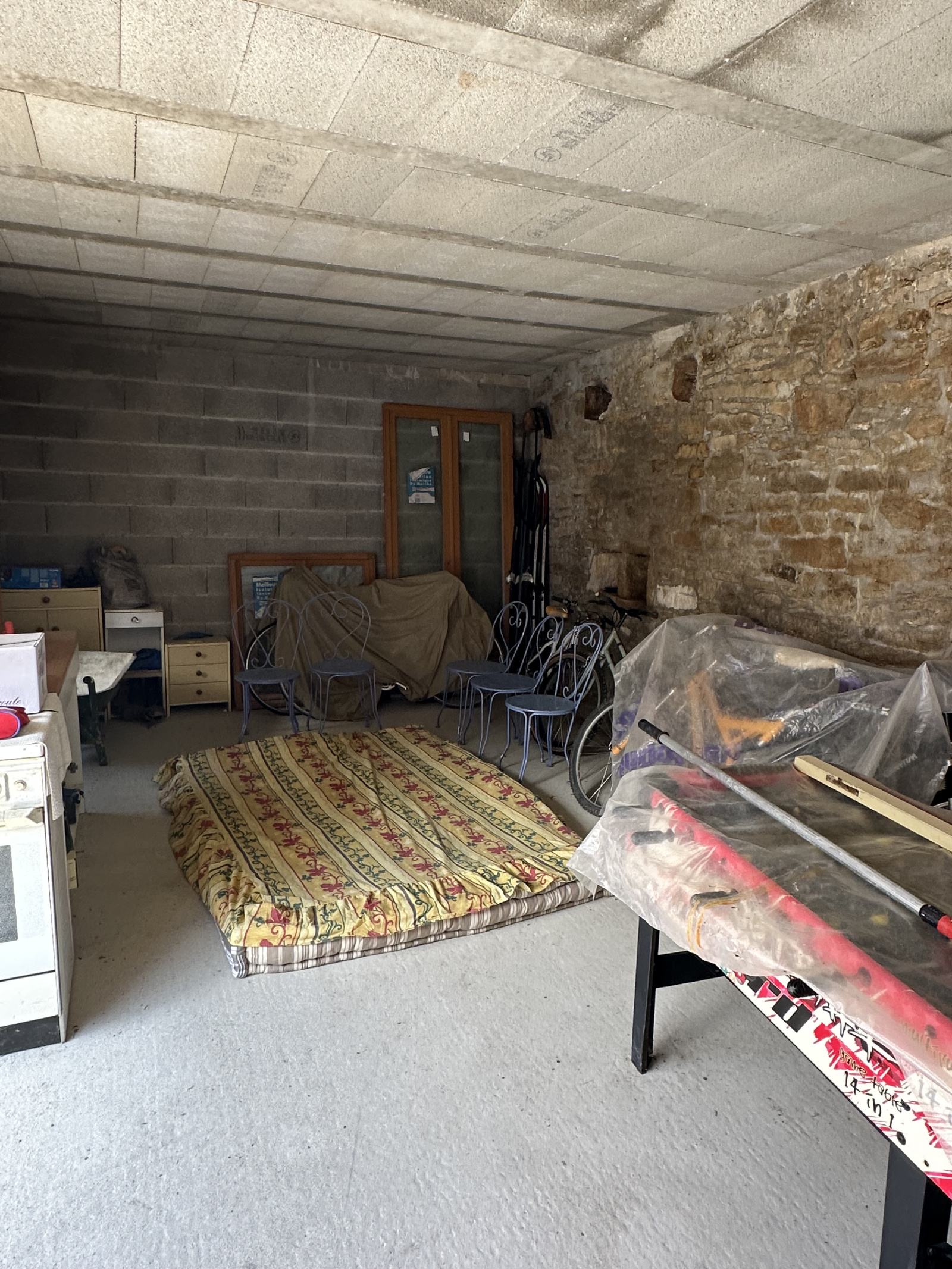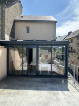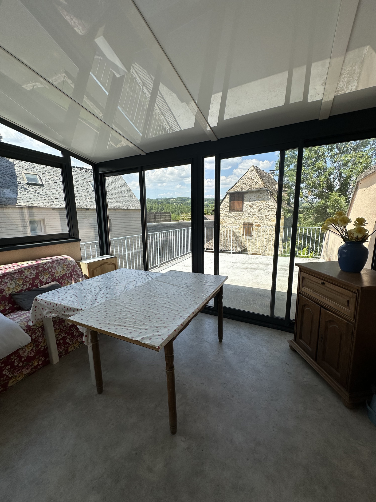 Elle offre aujourd’hui un espace de vie principal, prolongé par une véranda récente ouvrant sur une grande terrasse en béton, idéale pour profiter des beaux jours.
